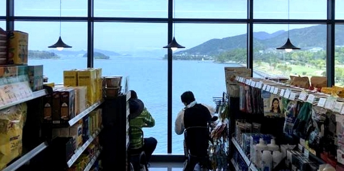 이 편의점은 바로 남해에 위치한 CU 남해평산점. 창가에는 모든 손님들이 바다를 바라 보며 음식을 먹을 수 있게끔 1인 테이블이 놓여 있다.