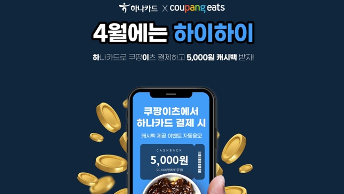 쿠팡이츠에서 빠르고 편리하게 배달 음식을 이용하는 하나카드 손님을 대상으로 추첨을 통해 5천원 캐시백 혜택을 제공한다.