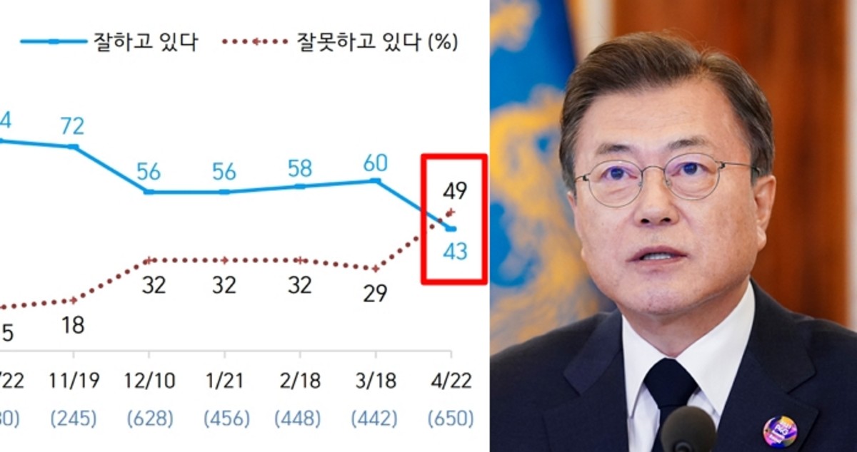 23일 한국갤럽이 발표한 바에 따르면 지난 20일부터 22일까지 3일 동안 전국 만 18세 이상 1,003명을 대상으로 정부의 코로나19 대응에 관해 물은 결과 '잘하고 있다' 43%, '잘못하고 있다' 49%로 집계됐다.