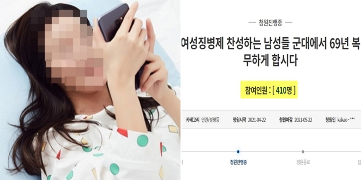 지난 22일 청와대 청원 게시판에 "여성징병제 찬성하는 남성들 군대에서 69년 복무하게 합시다"라는 청원이 올라왔다.