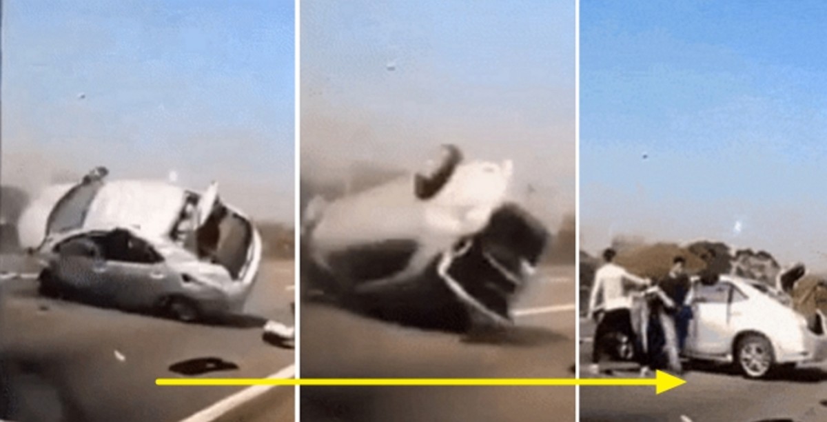 그런데 잠시 뒤 놀라운 광경이 눈앞에서 펼쳐진다. 전복 사고로 심하게 훼손된 차량 안에서 한 남성이 차 안에서 멀쩡히 나온 것이다.