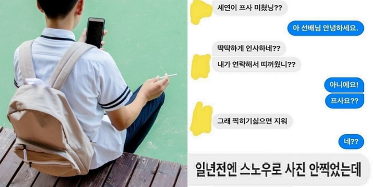 그는 09년생 후배의 답장이 딱딱하다는 이유로 "개념이 없다" 등의 시비를 건다. 이어 카메라 어플을 이용해 사진을 찍어 개인 SNS 프로필에 올린 후배의 행동이 보기 불편하다고 지적한다.