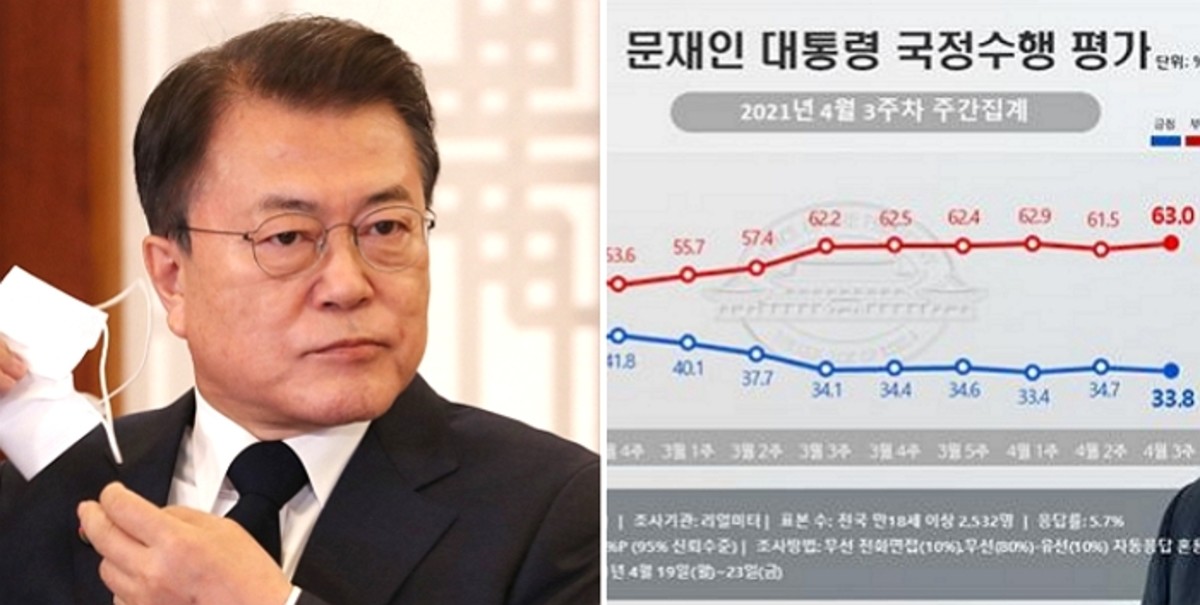 리얼미터가 YTN 의뢰로 지난 19일부터 23일까지 전국 성인남녀 2532명을 대상으로 여론조사를 진행한 결과 문 대통령의 국정수행 지지율은 지난주 보다 0.9%포인트 내린 33.8%로 집계됐다.