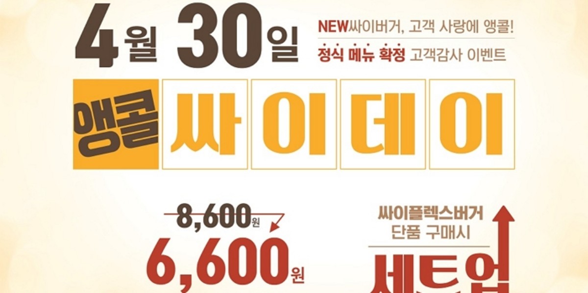 오는 4월 30일 앵콜싸이데이에 싸이플렉스버거 단품 구매 시, 케이준 양념감자와 콜라가 포함된 세트로 무료 업그레이드 혜택을 받을 수 있다.