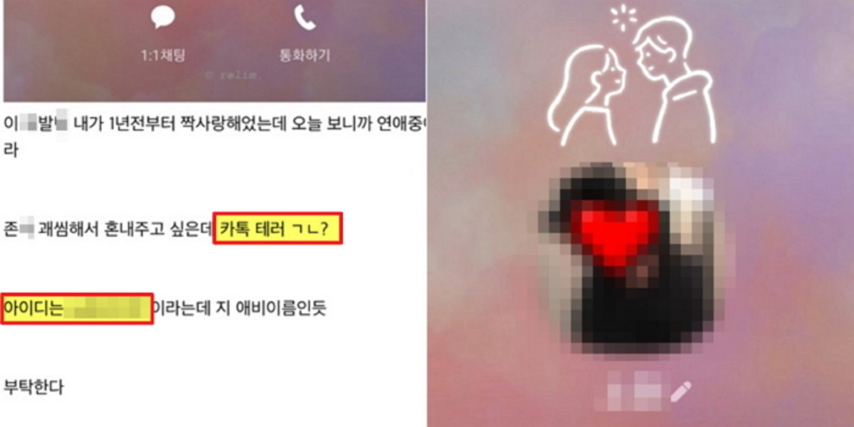 그는 "이 X발X 내가 1년 전부터 짝사랑했었는데 오늘 보니까 연애중이더라"라며 너무 괘씸해서 누리꾼들에게 카톡 테러를 요청하기 위해 여성의 카톡 정보를 공개한다고 밝혔다.
