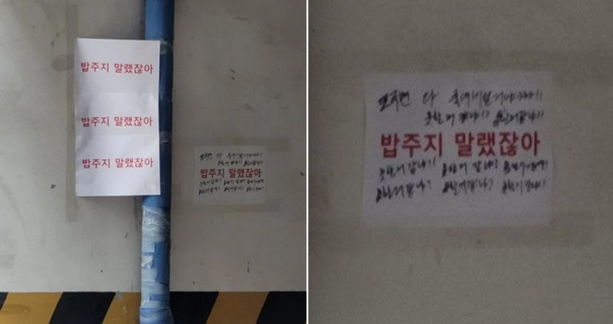 공개된 사진 속 경고장은 단순한 내용이지만 강력했다. A4 용지에 새빨간 글씨로 "밥 주지 말랬잖아"라는 일곱 글자만 적혀있었다.
