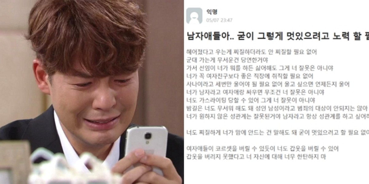 작성자 A씨는 "헤어졌다고 우는 게 찌질하더라도 안 찌질할 필요 없어. 군대 가는 게 무서운 건 당연한거야"라며 말문을 열었다.