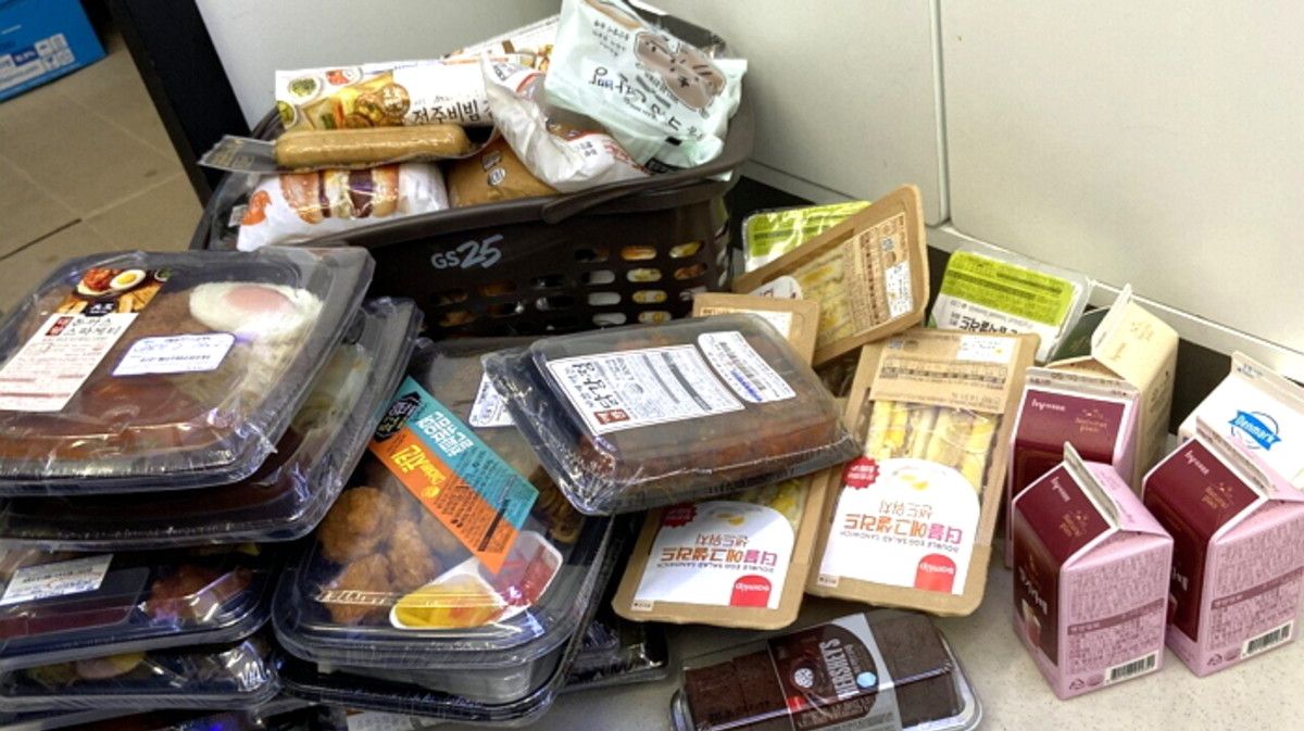 작성자 A씨는 김밥, 샌드위치, 우유, 빵, 도시락, 두부 등이 가득 쌓인 바닥 사진을 첨부했다.