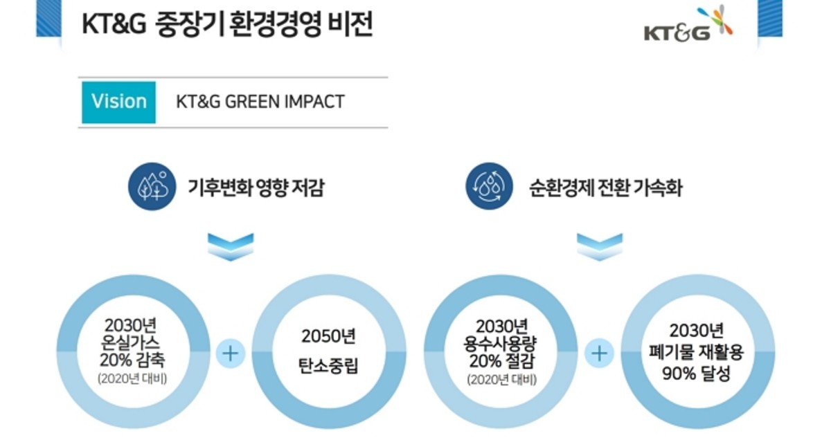 KT&G는 이러한 중장기 계획을 담은 환경경영 비전을 회사 공식 홈페이지에 공개했다. 기업 운영과 밸류체인 전반이 주는 기후영향을 최소화해 'GREEN IMPACT'를 확산시키고자 하는 친환경 경영 의지를 반영한 것으로, TCFD(기후변화 관련 재무정보공개 협의체) 권고안과 SBT(과학기반 감축 목표) 국제 가이드라인에 근거해 목표를 설정했다.
