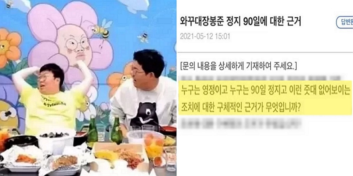 13일 한 온라인 커뮤니티에는 '와꾸대장봉준(봉준) 정지 90일에 대한 근거'라는 제목의 글이 올라왔다.
