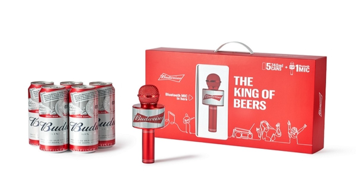 버드와이저는 버드와이저 740ml 캔맥주 5개와 블루투스 마이크 1개로 구성된 '마이크 패키지'를 전국 대형마트에서 이달 하순부터 판매한다.