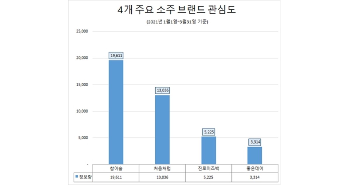 분석 대상 브랜드는 올 1분기 정보량 순으로 참이슬, 처음처럼, 진로이즈백, 좋은데이(㈜무학, 등이다.