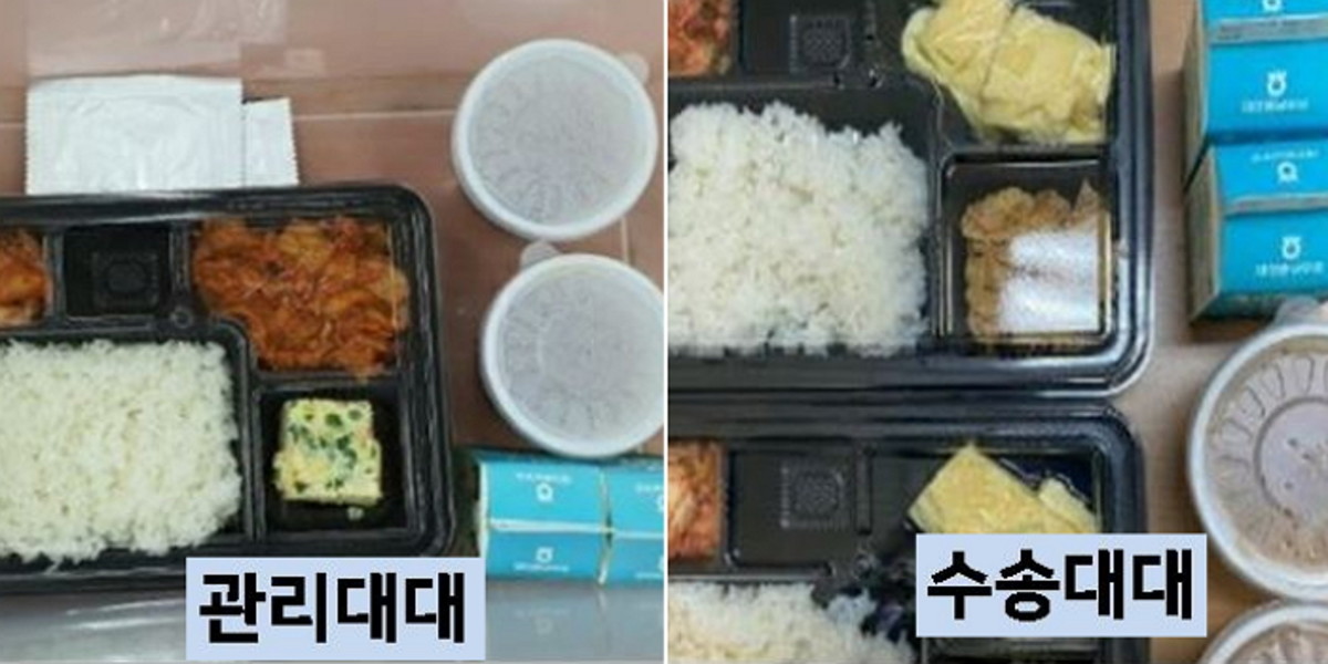 밥과 계란, 김치, 김, 우유 등과 같은 반찬이 담긴 모습이었다. 국을 포함해 '1끼 4찬' 원칙이 지켜진 것으로 보인다.