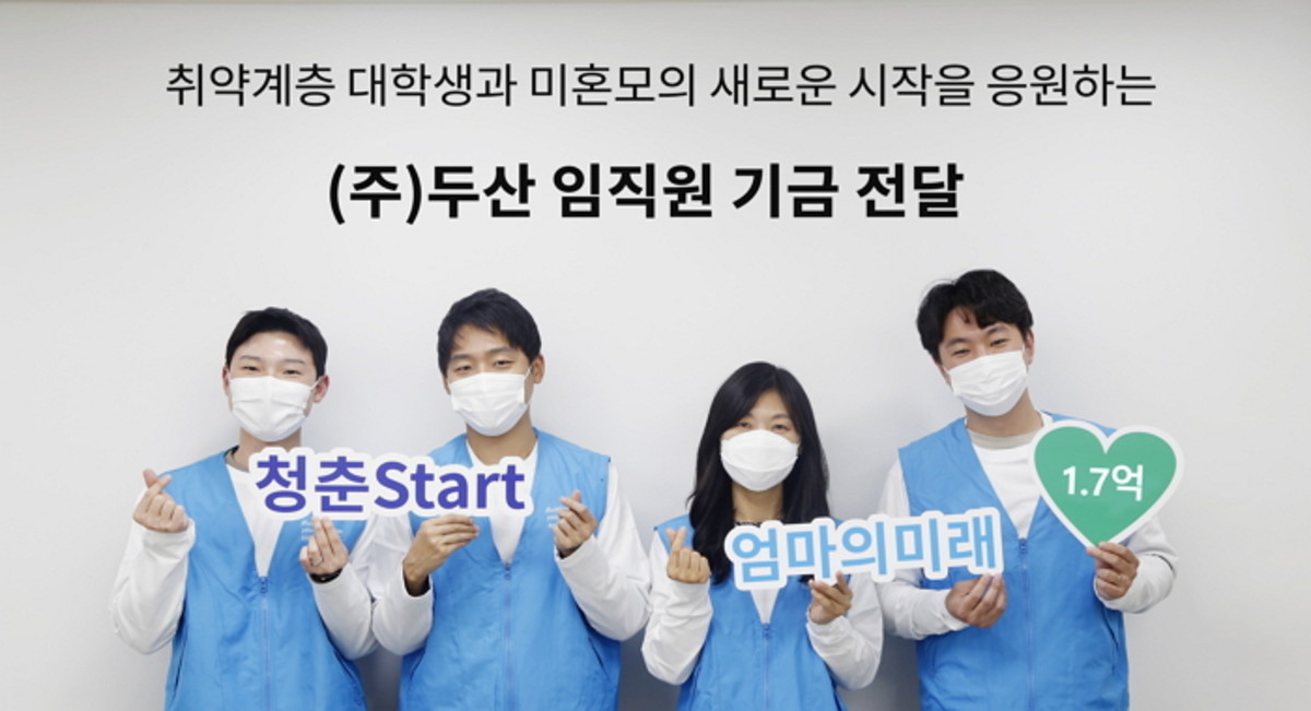 이 기부금은 ㈜두산 임직원들이 지난 한 해 동안 모금한 것으로, 임직원 기금위원회에서 선정된 사회공헌 사업 '청춘Start!'와 '엄마의 미래'에 사용된다.