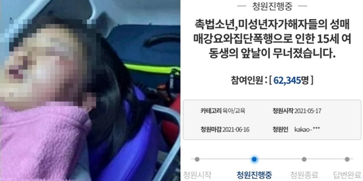 지난 17일 청와대 국민청원 게시판에는 "촉법소년, 미성년자 가해자들의 성매매 강요와 집단 폭행으로 인한 15세 여동생의 앞날이 무너졌습니다"라는 제목의 청원글이 올라왔다.