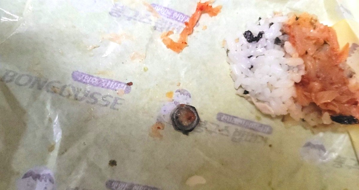 그는 아무런 의심 없이 주먹밥을 먹기 시작했다. 주먹밥을 거의 다 먹을 때쯤 그는 밥에서 딱딱한 물질이 씹었고, 즉시 뱉어 확인했다.