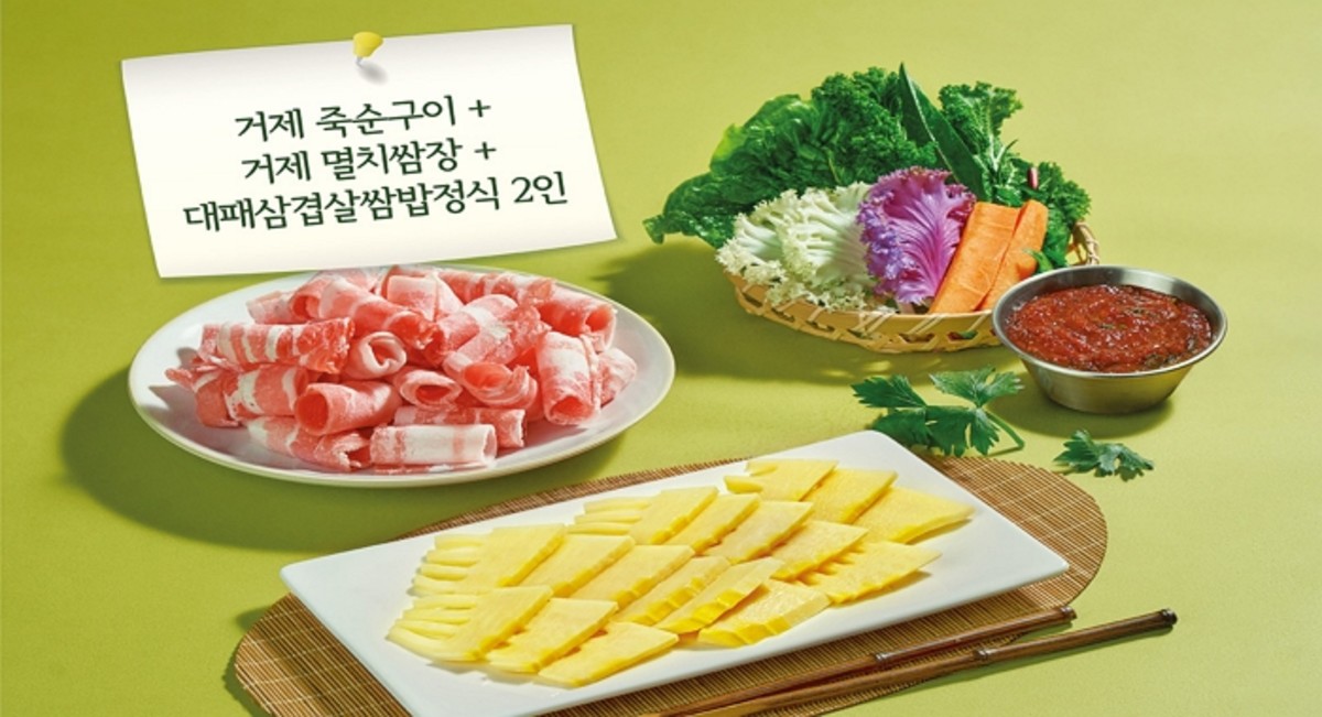이번 '거제도 한상'은 원조쌈밥집의 대표 메뉴인 '대패삼겹살 쌈밥정식(2인)'과 '거제 죽순구이', '거제 멸치쌈장'을 함께 구성했다.