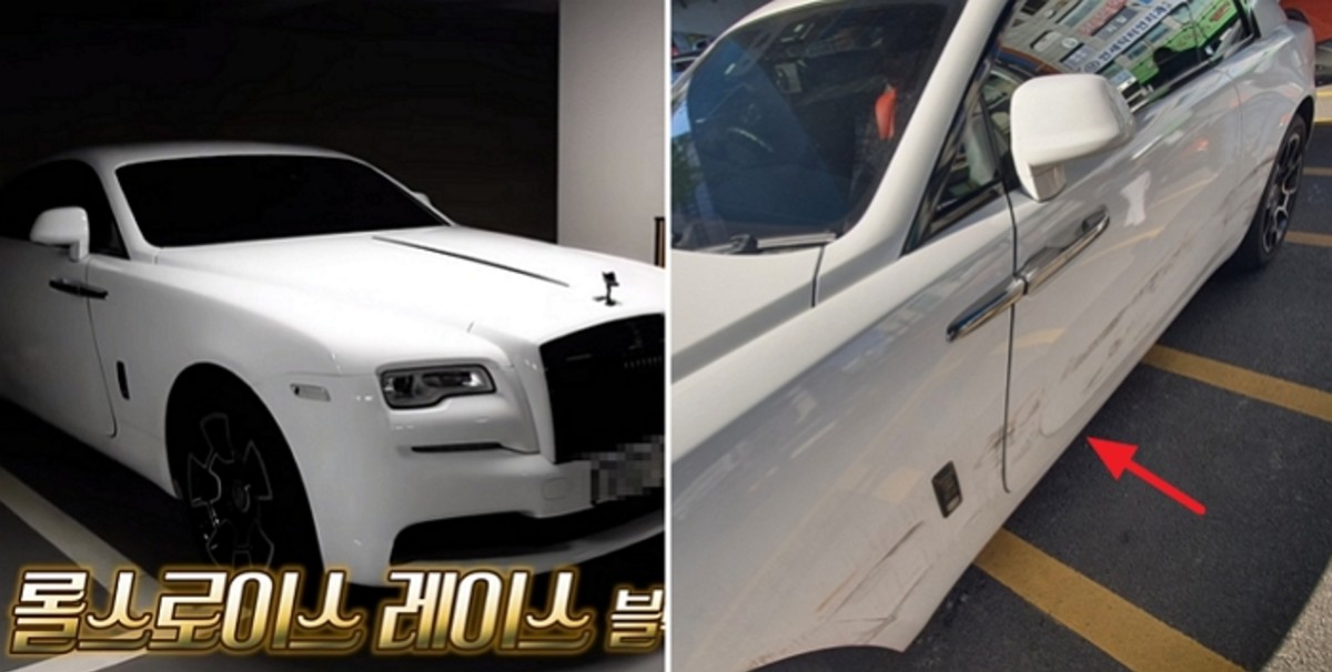 공개된 사진에는 차량 옆면이 긁힌 흰색 롤스로이스의 모습이 담겼다. 앞쪽 범퍼는 물론 뒤쪽 범퍼까지 검게 스크래치가 나 있다.