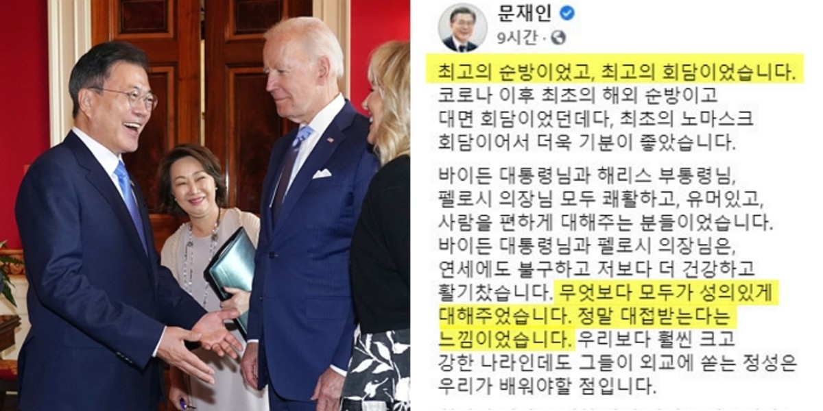이번 일정이 코로나 이후 최초의 해외 순방이고 최초의 노마스크 회담이어서 더욱 기분이 좋았다고도 덧붙였다.