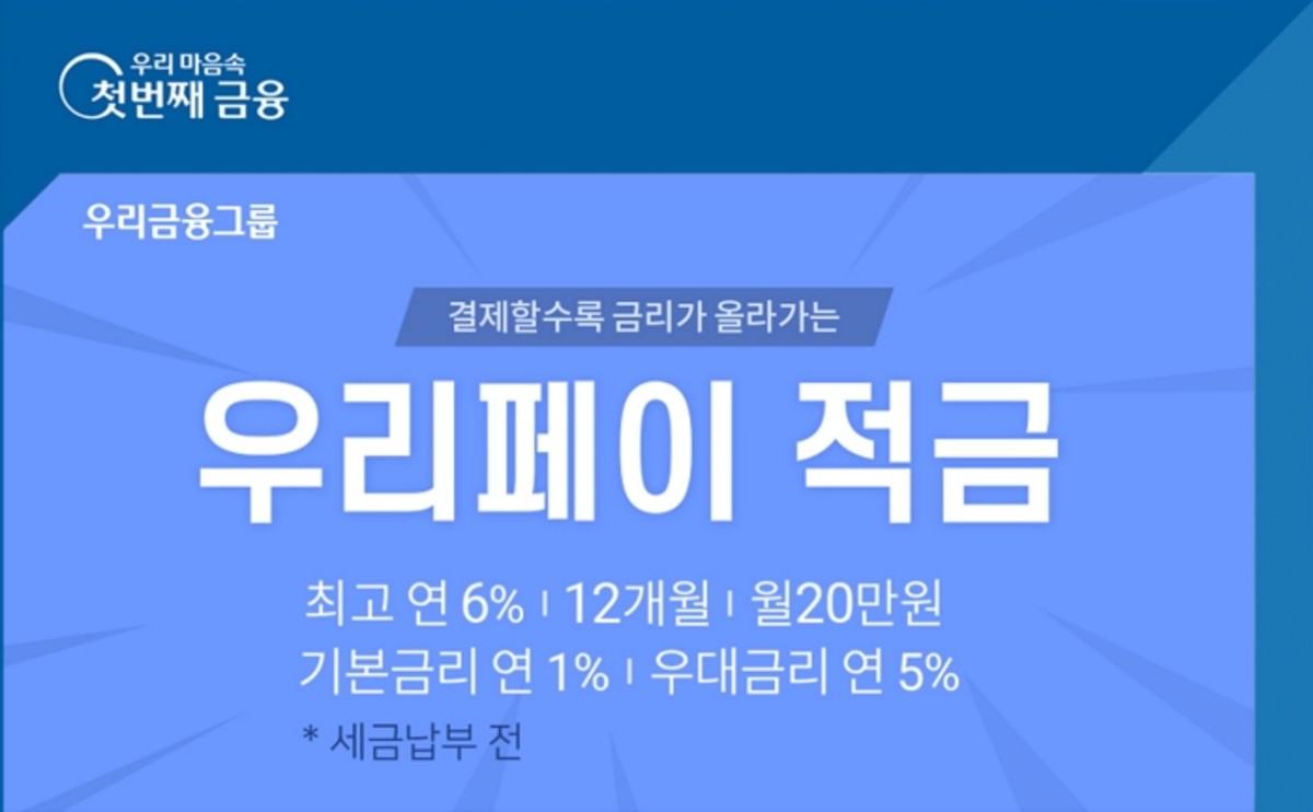 '우리페이 적금'의 가입기간은 1년이며, 월 납입 한도는 최대 20만원이다. 금리는 기본금리 연 1.0%에 우대금리 최대 연 1.0%p와 특별우대금리 최대 연 4.0%p를 더해 최고 연 6.0%다.