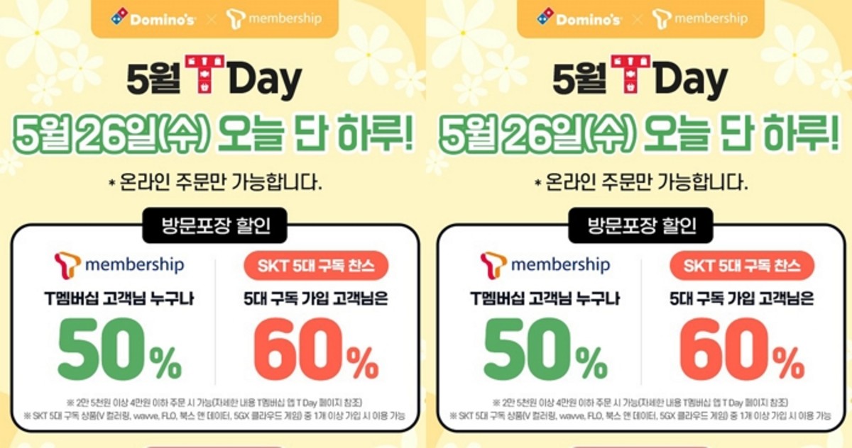 도미노피자는 내일(26일) 하루 동안 SK텔레콤 T멤버십 회원을 대상으로 모든 메뉴 온라인 방문포장 주문 시 5대 구독 상품 가입 고객에게는 60%, 미 가입 고객에게는 50% 할인쿠폰을 제공하는 프로모션을 진행한다. 단, 2만 5천원 이상 4만원 이하 주문 시 할인 적용 가능하다.
