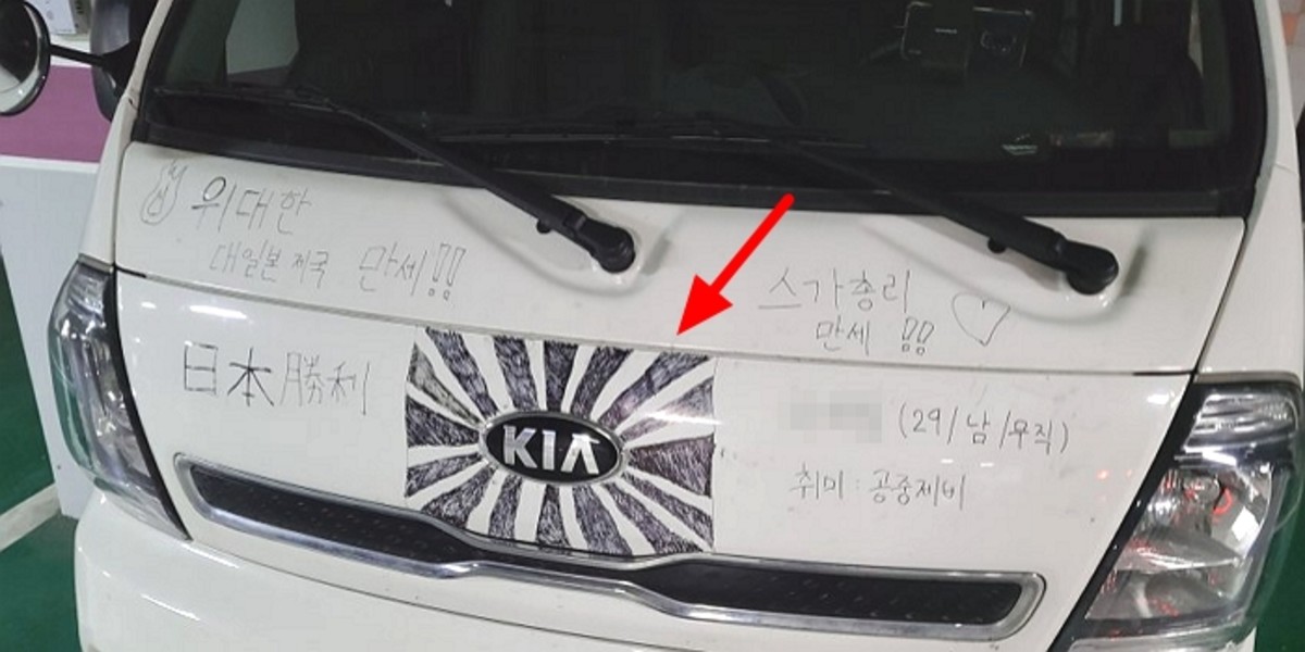 그의 하얀색 트럭 한가운데에 박힌 기아차 로고가 '욱일기'처럼 변해 있었기 때문이다. 그 옆에는 "위대한 대일본 제국 만세" 따위의 문구까지 적혀 있었다.