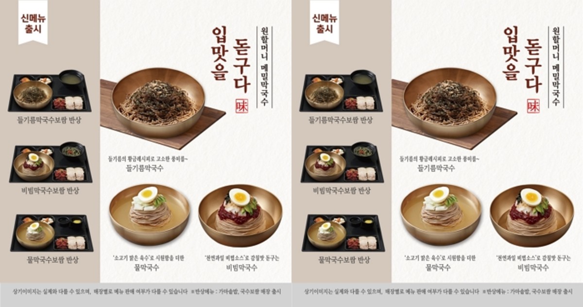 이번 신메뉴는 '들기름막국수'와 '비빔막국수', '물막국수' 등 3종으로 여름과 잘 어울리는 메밀을 사용해 더운 여름철 지친 입맛을 살리기에 제격인 메뉴다.
