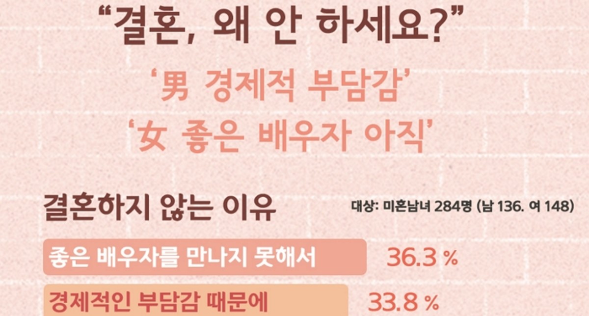 먼저 '결혼을 하지 않는 이유'로 '좋은 배우자를 만나지 못해서(36.3%)'와 '경제적 부담감 때문에(33.8%)'를 선택한 이들이 많았다. 이어 '결혼이 행복해 보이지 않아서(16.9%)', '솔로 생활이 편해서(13%)' 등을 꼽았다.