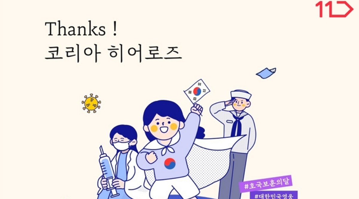 [인사이트] 전준강 기자 = 11번가가 '호국보훈의 달' 6월을 맞아 나라를 위해 헌신하고 있는 분들에게 감사의 메시지를 전하는 고객참여 이벤트 'Thanks! 코리아 히어로즈'를 6월 1일부터 진행한다고 밝혔다.