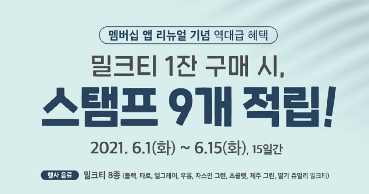 참여 방법은 간단하다. 밀크티 8종 중 1종 구매 시 멤버십 앱 내 'MY 쿠폰'에 있는 '스탬프 9개 적립 쿠폰'을 제시하면 된다. 쿠폰은 기존 회원에게는 6월 1일 0시, 신규 회원에게는 가입 즉시 발급된다.