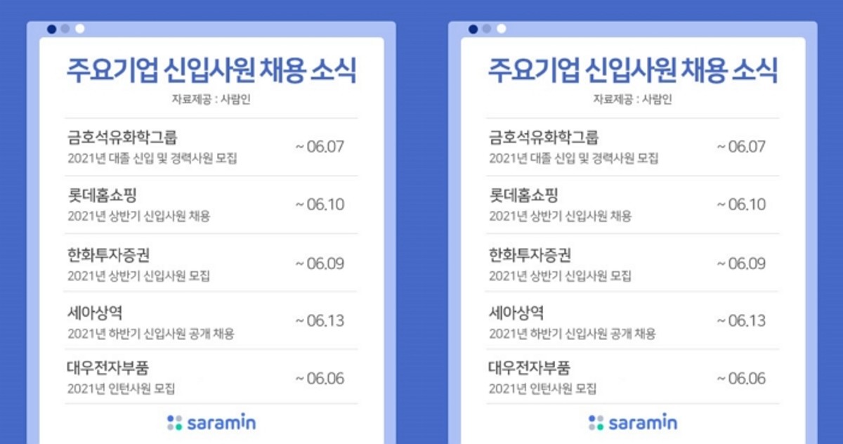 구인구직 매칭플랫폼 사람인이 국내 주요기업 공채 정보를 정리했다고 밝혔다.