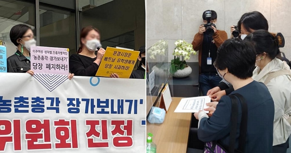 한국이주여성인권센터와 공익인권법재단 공감은 이에 지난달 28일 서울 중구 인권위 앞에서 기자회견을 열고 '농촌 총각 장가보내기 사업'을 추진한 문경시를 규탄했다.