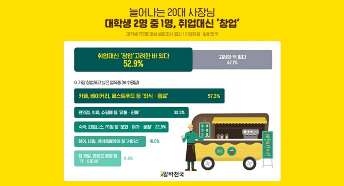 [인사이트] 전준강 기자 = '알바천국'이 대학생 792명에게 설문조사를 실시한 결과, 절반 이상(52.9%)이 취업대신 '창업'을 고려한 바 있다고 답하는 등 창업에 대한 관심이 높았다고 밝혔다.