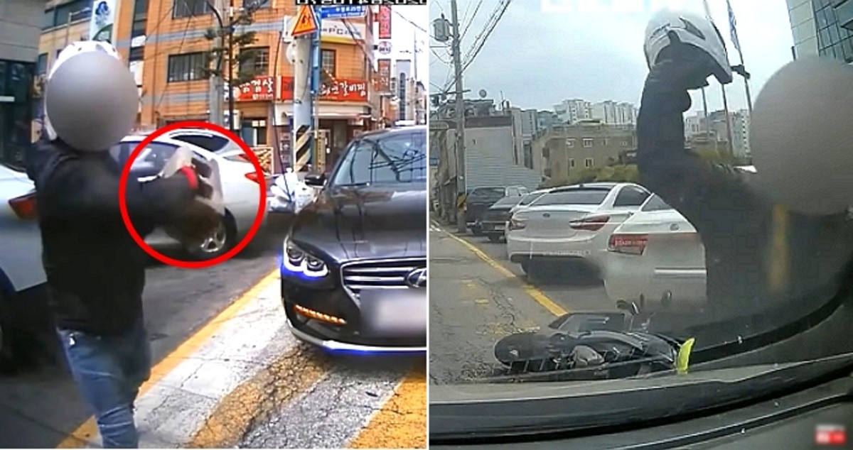 사고 피해자였던 오토바이 운전자는 발길질로 양쪽 사이드미러를 부수더니 이윽고 벽돌을 가져와 차량의 뒷 유리창을 부쉈다.