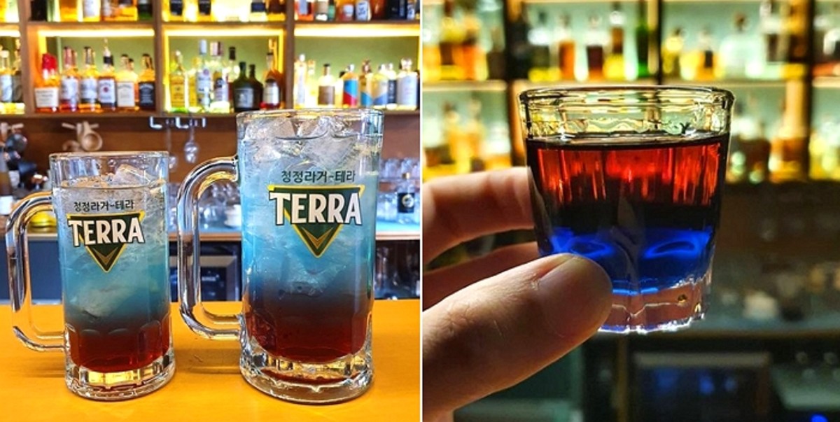 '태극주'는 '홍초+파워에이드+소주'의 조합으로 탄생했다. 진한 붉은색과 푸른색 음료수가 소주와 잘 어우러져 영롱한 색감을 뽐낸다.