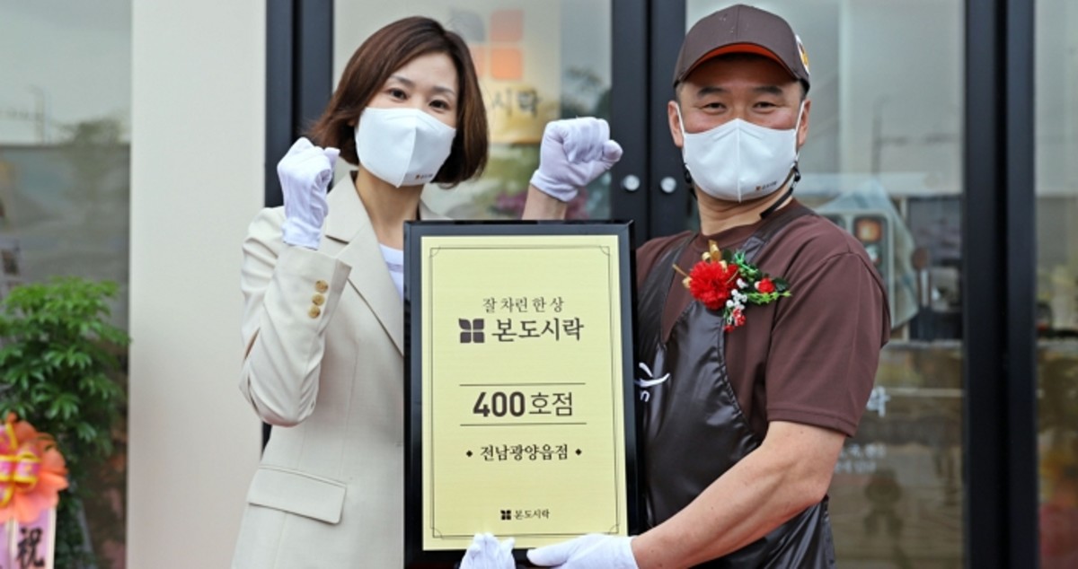 이진희 대표이사는 "전국 가맹점 사장님들과의 지속적인 소통과 성장으로 사랑받아 온 본도시락이 인기 메뉴인 '광양식바싹불고기'의 본고장에서 '400호점' 달성의 결실을 맺게 돼 매우 뜻깊다"라며, "앞으로도 본도시락은 국내 소비자들에 건강한 식사를 제공하는 동시에 우리 사회 곳곳을 살피는 나눔 활동으로 보내주신 관심과 성원에 보답할 계획이다"라고 말했다.