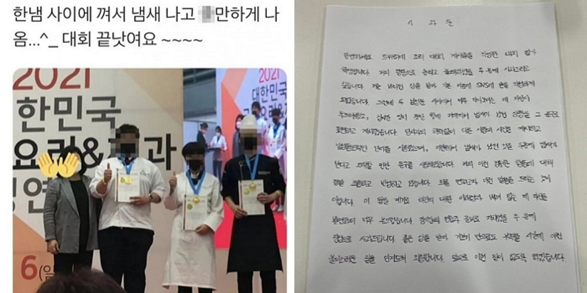 '2021 대한민국 국제요리 & 제과 경연대회' 참가자로 확인된 그는 대회가 끝났다며 글 하나를 올렸는데, 여기서 쓴 표현이 문제가 됐다.