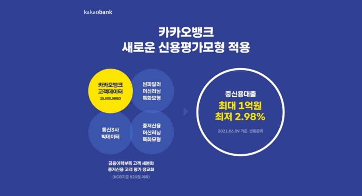 카카오뱅크는 새로운 신용평가 모형 적용과 함께 '중신용대출'의 대출한도를 최대 7천만원에서 1억원으로 높이고, 금리를 최대 1.52%포인트 인하하기로 했다. 카카오뱅크는 지난 3월 5,000만원에서 7,000만원으로 대출한도를 확대했으며, 대출금리는 지난 5월에도 최대 1.20%포인트 인하했다.
