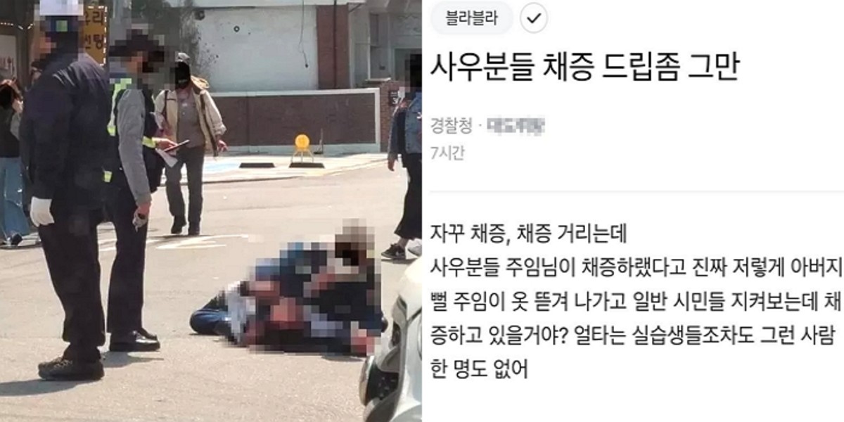해당 게시글에는 경찰 제복을 입은 흰머리의 남경이 바닥에 누워있는 주취자를 온몸으로 제압하는 사진이 담겼다. 남성 경찰의 제복 안에 입은 러닝셔츠가 밖으로 보였던 만큼 당시 대치 상황이 격렬했음을 짐작게 했다.