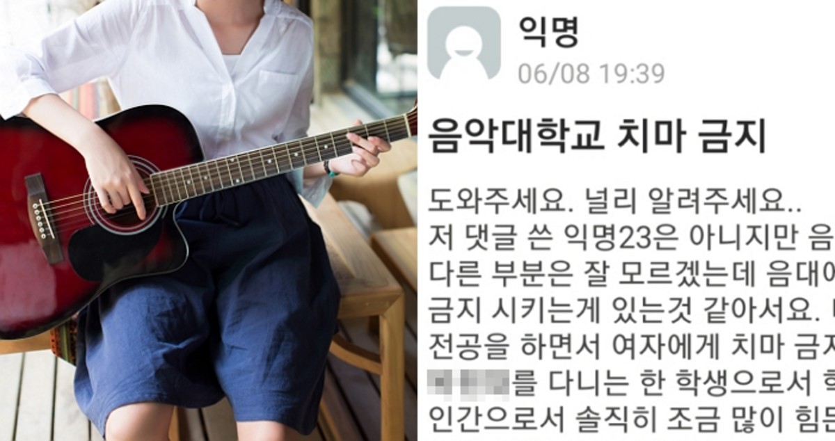 최근 대학생 온라인 커뮤니티 '에브리타임'에는 '음악대학교 치마 금지'라는 제목의 글이 게시돼 눈길을 끌었다.