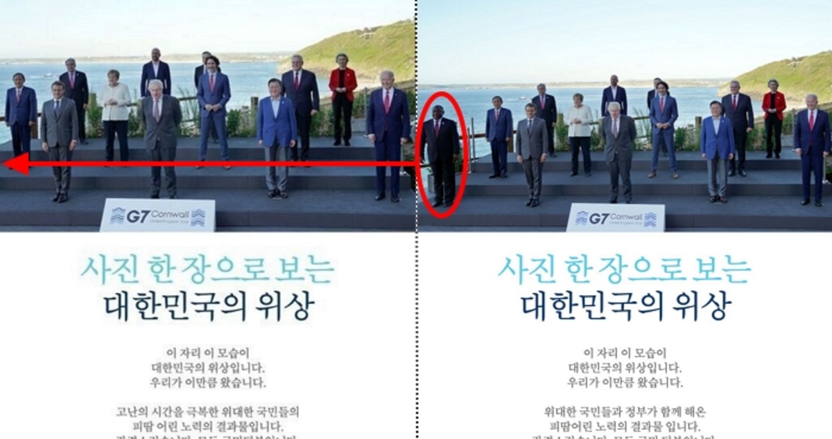 [인사이트] 함철민 기자 = 정부가 공식 SNS에 문재인 대통령이 함께한 주요 7개국(G7) 정상회담 참석 기념사진을 올리면서 남아프리카공화국 대통령을 잘라내 논란이 일고 있다.