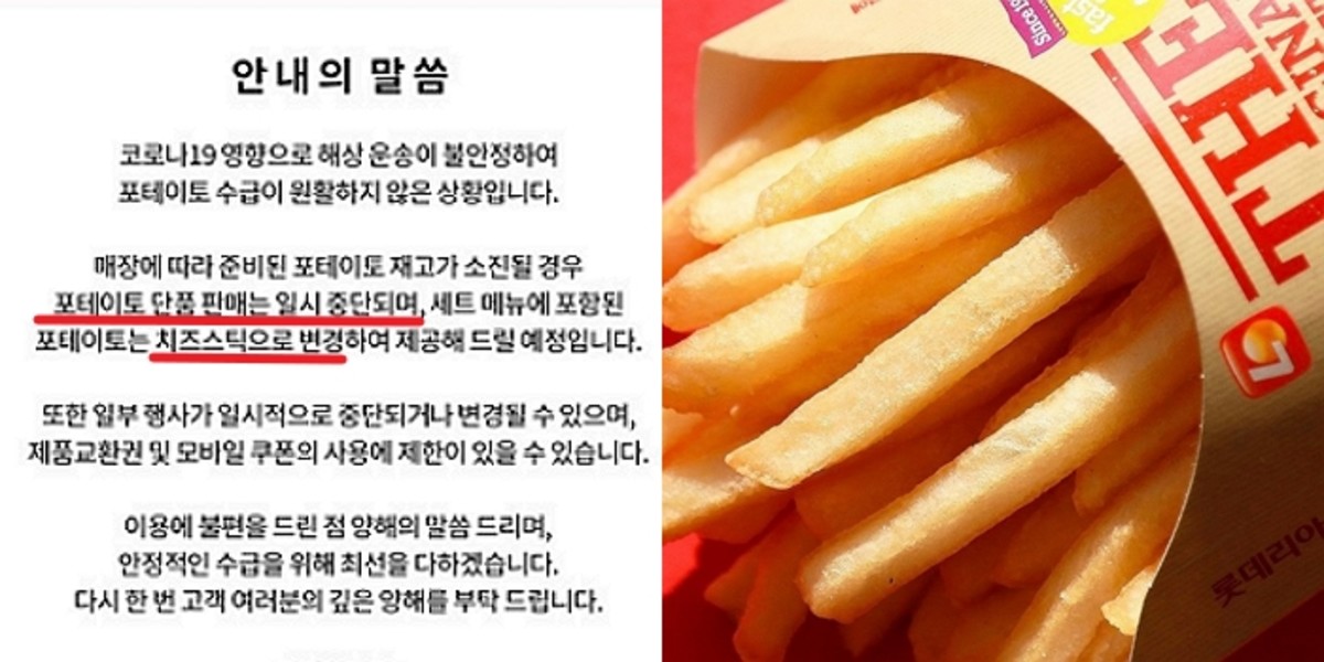 롯데리아는 "코로나19 영향으로 해상 운송이 불안정해 감자 수급이 원활하지 않다"라고 설명했다.