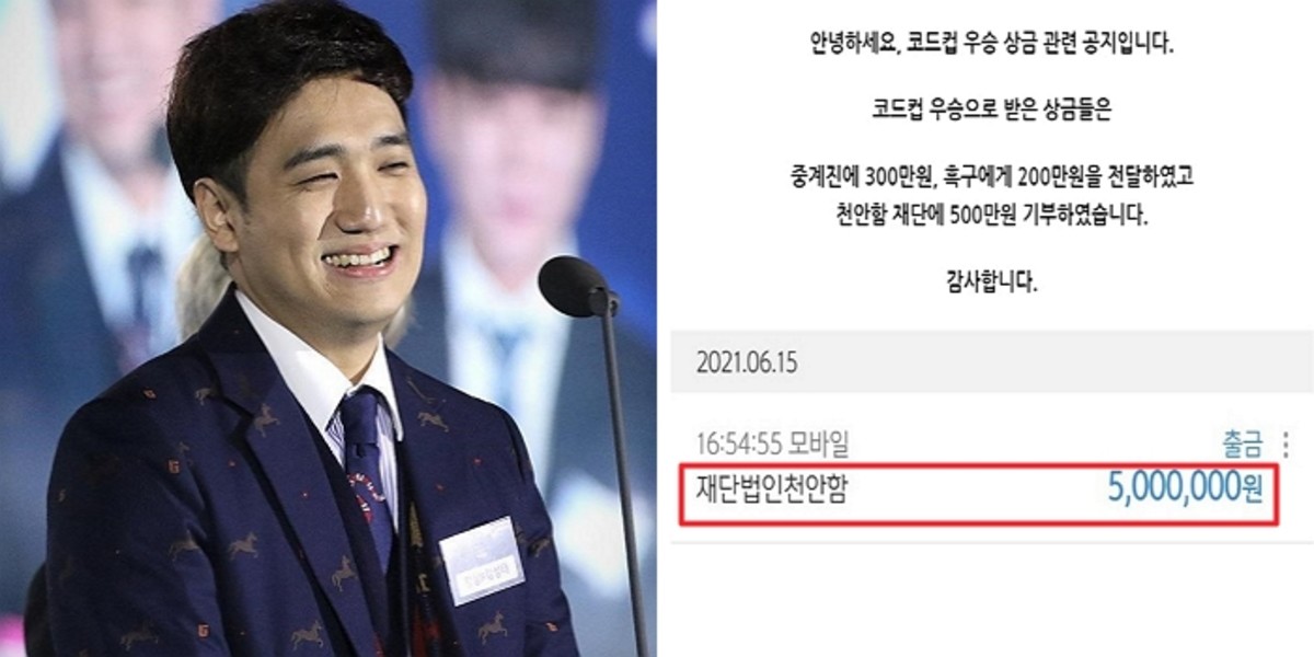 15일 킴성태는 자신의 아프리카 TV 채널 공지 게시판을 통해 코드컵 우승으로 받은 1,000만 원 중 500만 원을 천안함 재단에 기부했다고 밝혔다