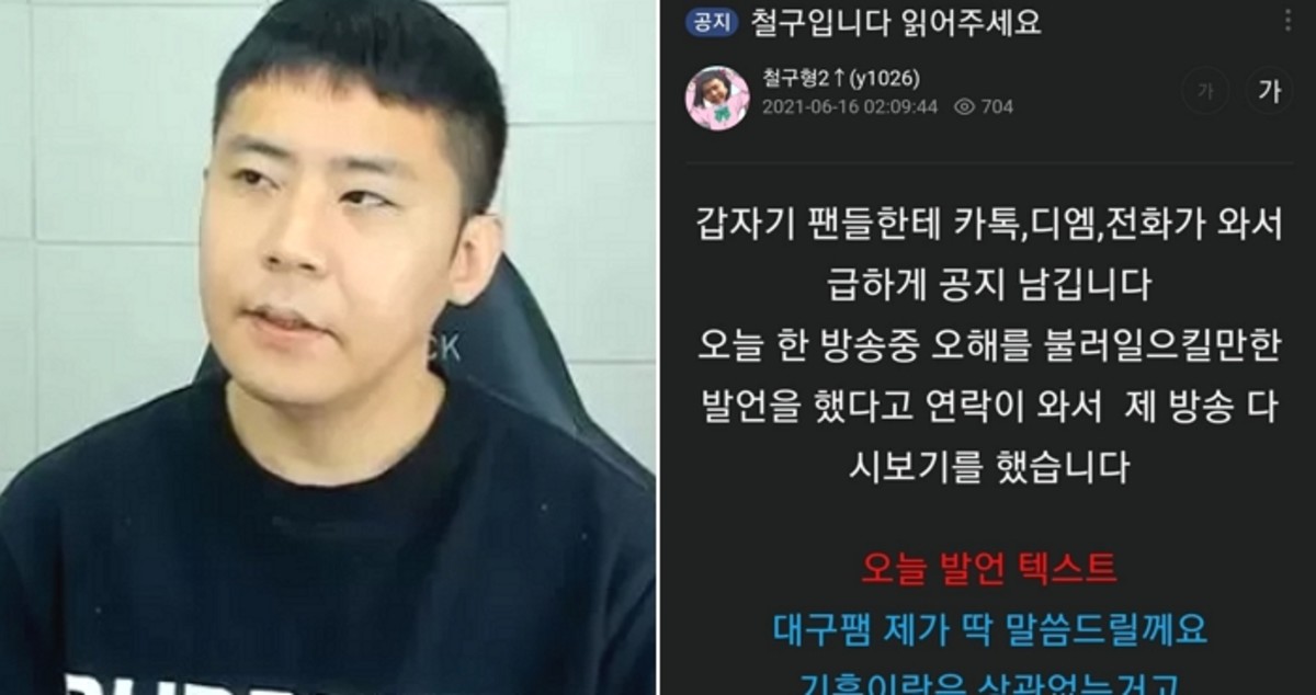 [인사이트] 원혜진 기자 = BJ 철구가 방송에서 언급한 내용에 대해 '지역 차별' 논란이 일자 사과했다.