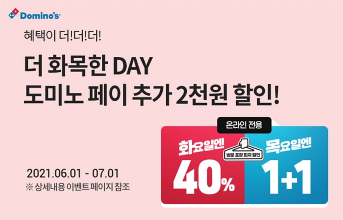 도미노피자 관계자는 "다가오는 주말을 기다리며 목요일을 보내는 고객들에게 에너지를 전하기 위해 피자 한 판 더 제공하는 '더 화목한 데이'를 준비했다"며 "온라인 방문 포장하시고 피자 두 판 모두 푸짐하게 즐기시길 바란다"고 말했다.