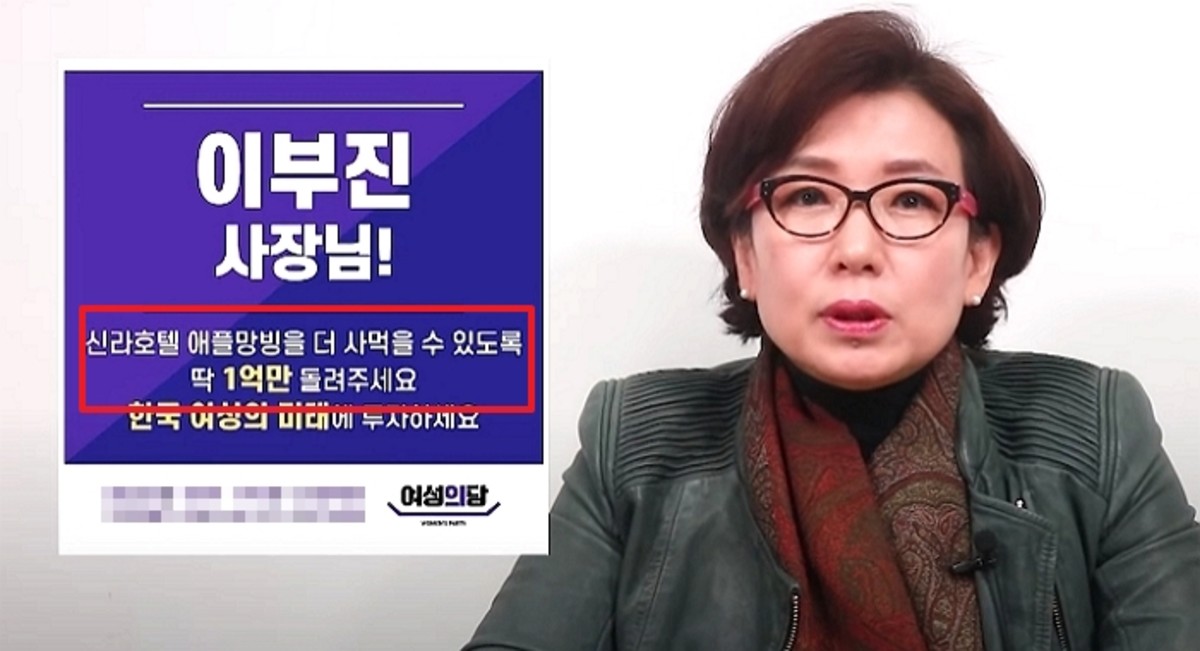 당시 여성의당은 '애플망빙'을 더 사 먹을 수 있도록 이부진 신라호텔 사장에게 1억원을 기부해달라는 문구를 담았다.