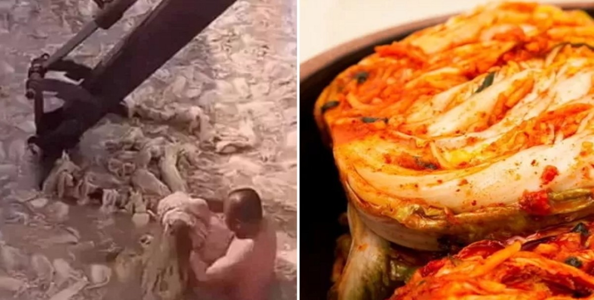 중국 김치공장에서 한 남성이 상의를 탈의하고 배추를 절이는 모습 / 온라인 커뮤니티