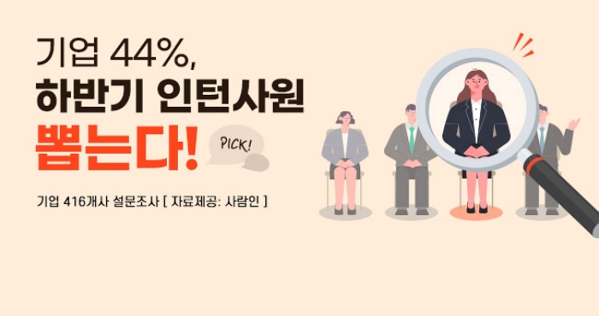 [인사이트] 전준강 기자 = 사람인이 기업 416개사를 대상으로 '하반기 인턴 채용 계획'을 조사한 결과, 44%가 '인턴을 채용한다'고 밝혔다.