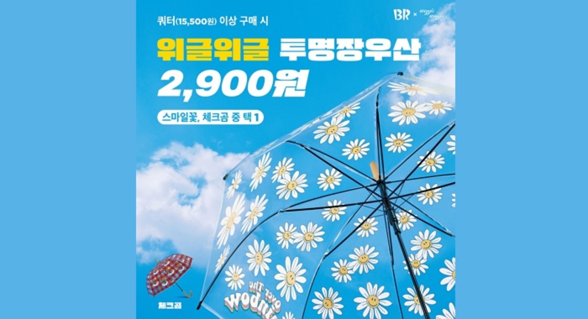 '위글위글 투명 장우산'은 다가오는 장마철 필수품인 장우산에 두가지 패턴의 디자인을 적용했다. 각각 활짝 웃는 데이지꽃 일러스트 '스마일 위 러브'와 브라운 체크와 배스킨라빈스 아이스크림을 즐기는 곰돌이 캐릭터를 그려 넣었다. 성인 혼자 넉넉히 사용하기 좋은 사이즈의 장우산으로 심미성과 실용성을 모두 갖췄다.