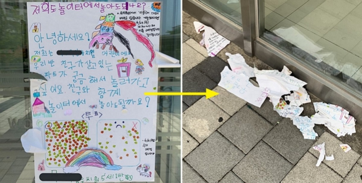 [인사이트] 조세진 기자 = 어느 아파트 단지에서 유치원생들이 붙인 포스터를 누군가 고의적으로 찢은 흔적이 발견돼 누리꾼들의 공분이 이어지고 있다.